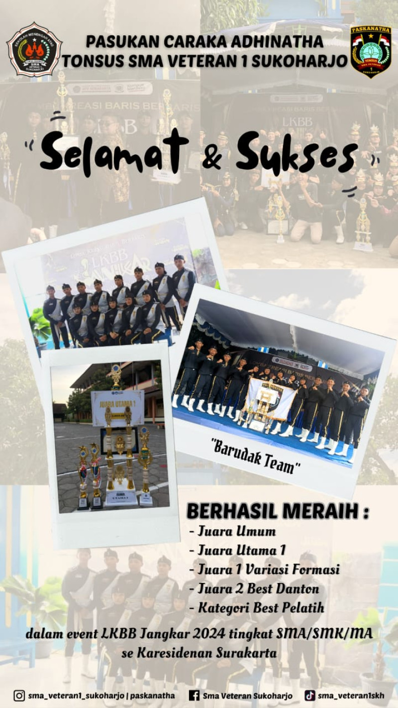 Belum genap 1 bulan terlewati, SMA Veteran 1 Sukoharjo melalui Pasukan Caraka Adhinatha yakni Tim Tonsus SMA Veteran 1 Sukoharjo meraih beberapa prestasi gemilang pada event LKBB Jangkar 2024 Tingkat SMA/SMK/MA se-Karisidenan Surakarta yang dilaksanakan pada Sabtu, 13 Januari 2024 di APN Surakarta.