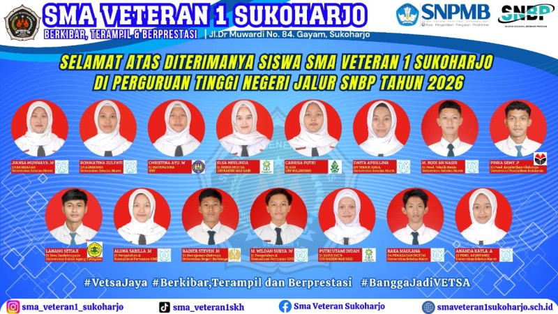 Sukoharjo, 1 April 2026 — Kabar membanggakan datang dari SMA Veteran 1 Sukoharjo. Sebanyak 15 siswa berhasil lolos Seleksi Nasional Berdasarkan Prestasi (SNBP) yang diumumkan pada 31 Maret 2026. Prestasi ini menjadi bukti nyata kerja keras siswa, guru, serta dukungan penuh dari seluruh warga sekolah.